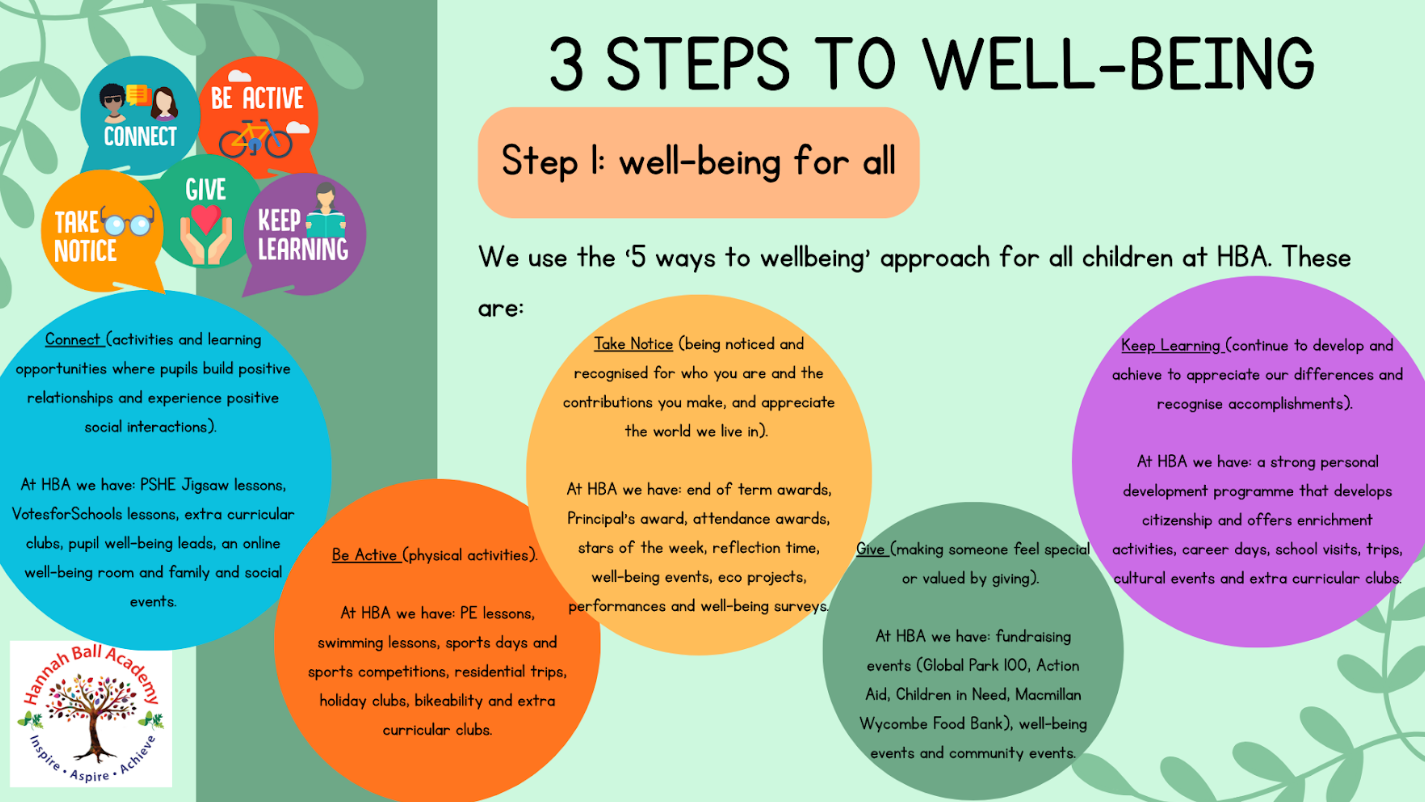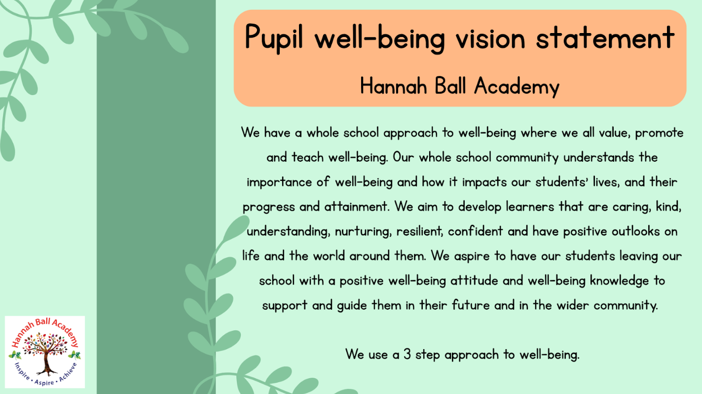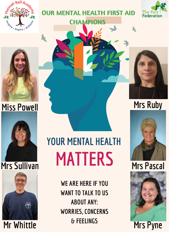 Miss Powell is the Senior Mental Health Lead at Hannah Ball Academy. She has undertaken numerous training courses on mental health for pupils and staff, and has completed the course called 'Establishing a Whole School Approach' to wellbeing. The aim of the whole school approach is that our whole community are knowledgeable and committed, talk freely about mental health, have a positive culture and to reduce the stigma around mental health, and do this collaboratively. It also aims for the whole community to raise quality and standards across the entire school for wellbeing.
